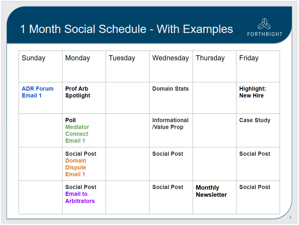 Here is a social media calendar that I implemented while working at ADRForum – Forthright