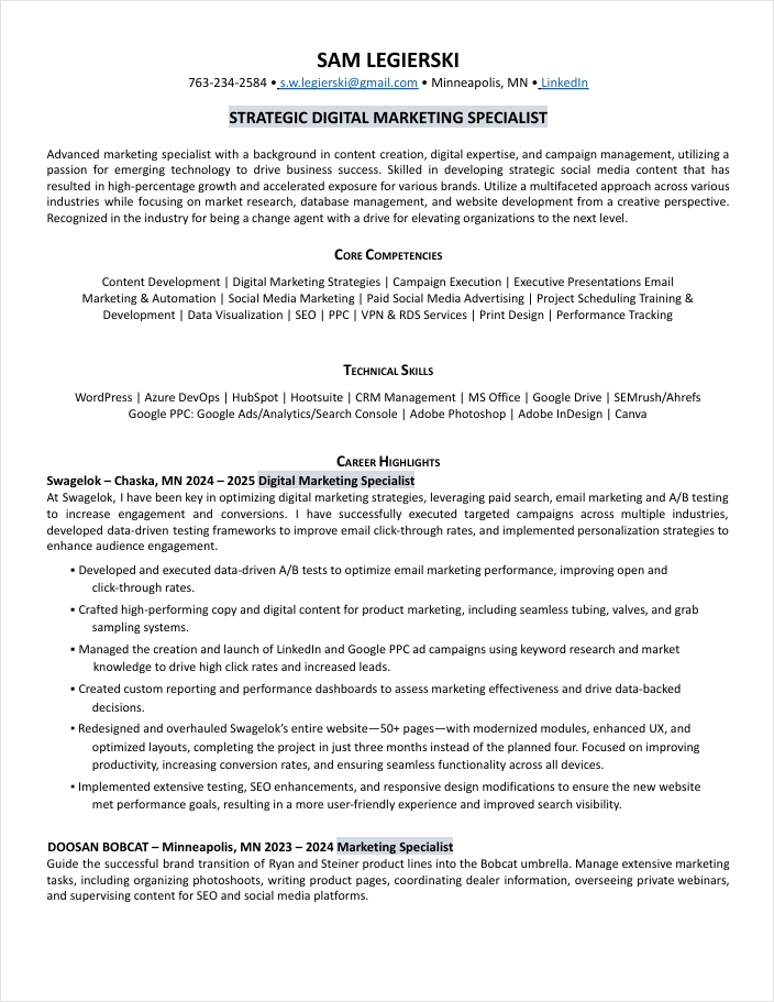 My resume highlights a range of experience across digital marketing, content strategy, SEO, paid media and brand development. From leading website redesigns to launching high-impact campaigns, it showcases the skills and results I bring to every project.